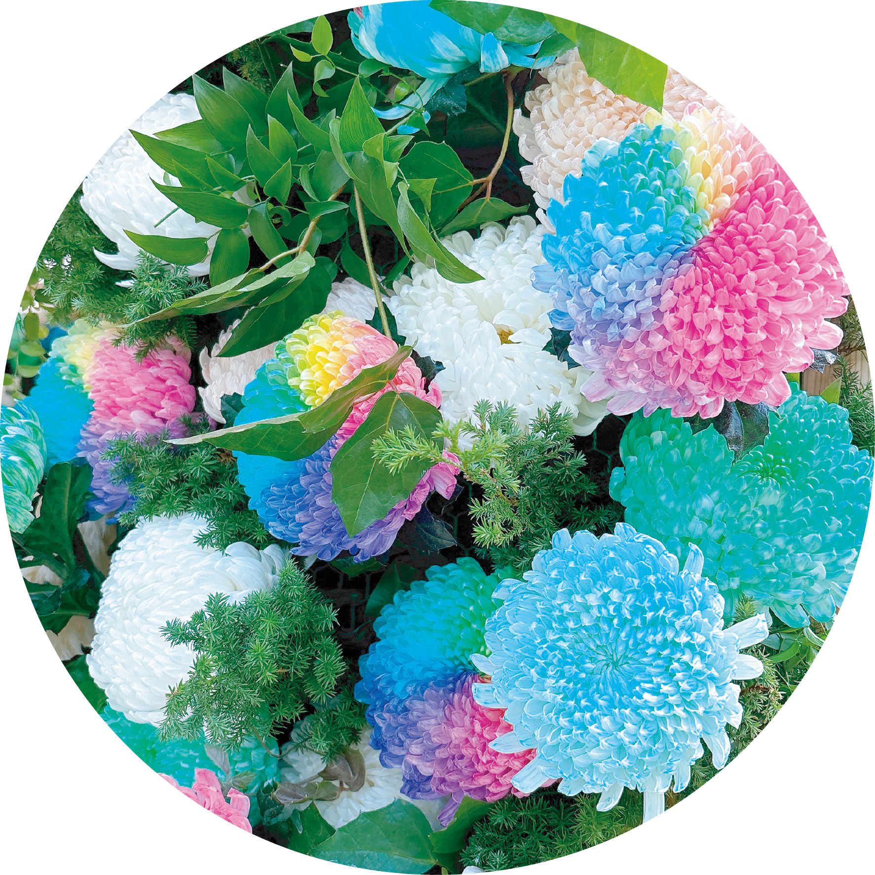 展示に使用するキクは、主に気品のある真っ白な「フルブルームマム」とカラフルに染めた「カラーリングマム」です。