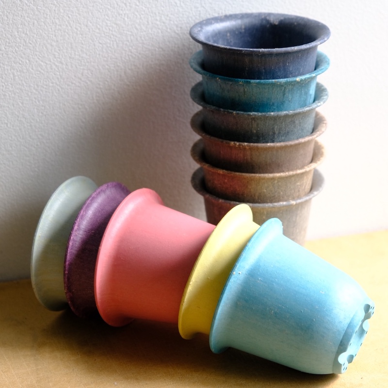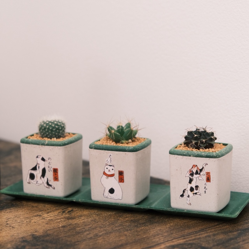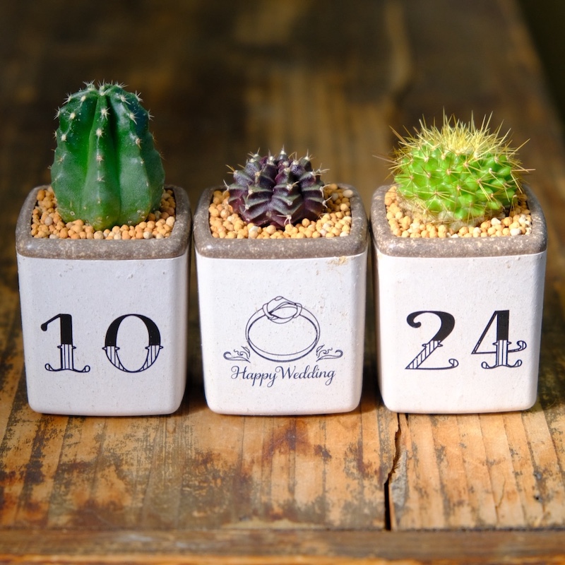 半分が木材で出来た「新感覚!植木鉢」とミニサボテン&多肉植物。